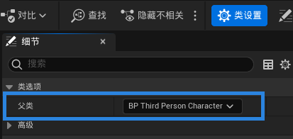 2、编辑metahuman蓝图>>类设置>>类选项>>父类>>选择。BP_ThirdPersonCharacter