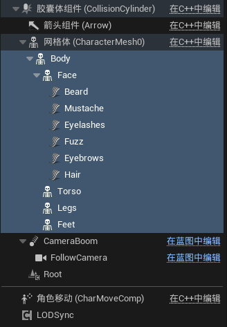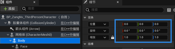 3、将metahuman蓝图中骨骼网络体组件(body)>>拖拽到BP_ThirdPersonCharacter的网格体(CharacterMesh0)中